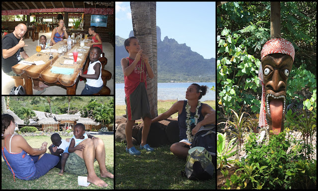 Il est l'heure de la douche (une bassine pour récupérer l'eau de la réserve ) .Pierrot raconte de belles histoires à Nao , les vêtements sèchent sur le tiaré ...